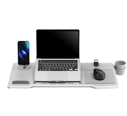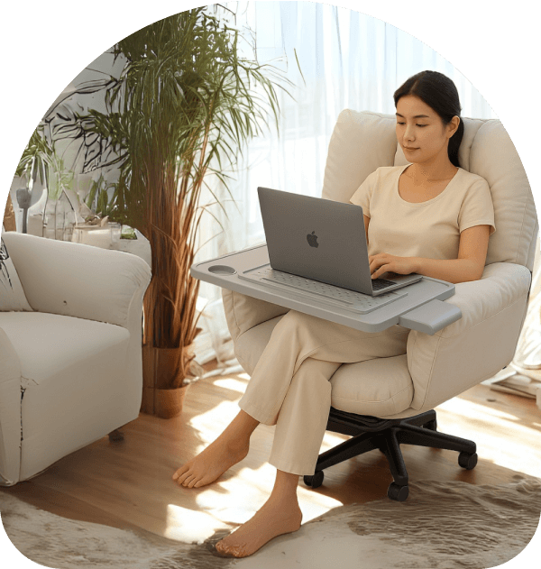 A sleek, detachable desk with slots for your laptop, phone, mouse, and coffee — turning any spot into your personal workspace. Free with your chair.