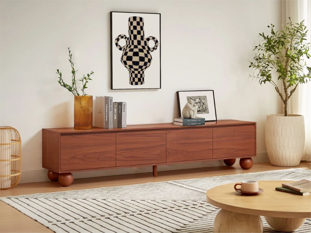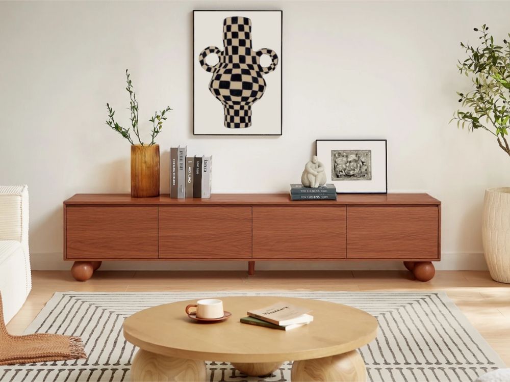 This TV unit encapsulates the enduring appeal of Mid-Century Modern design—clean lines, rounded forms, and a natural palette. Its proportions are intentionally low and wide, ideal for modern floor-planned homes, with just the right dose of personality to elevate your lounge with quiet confidence.