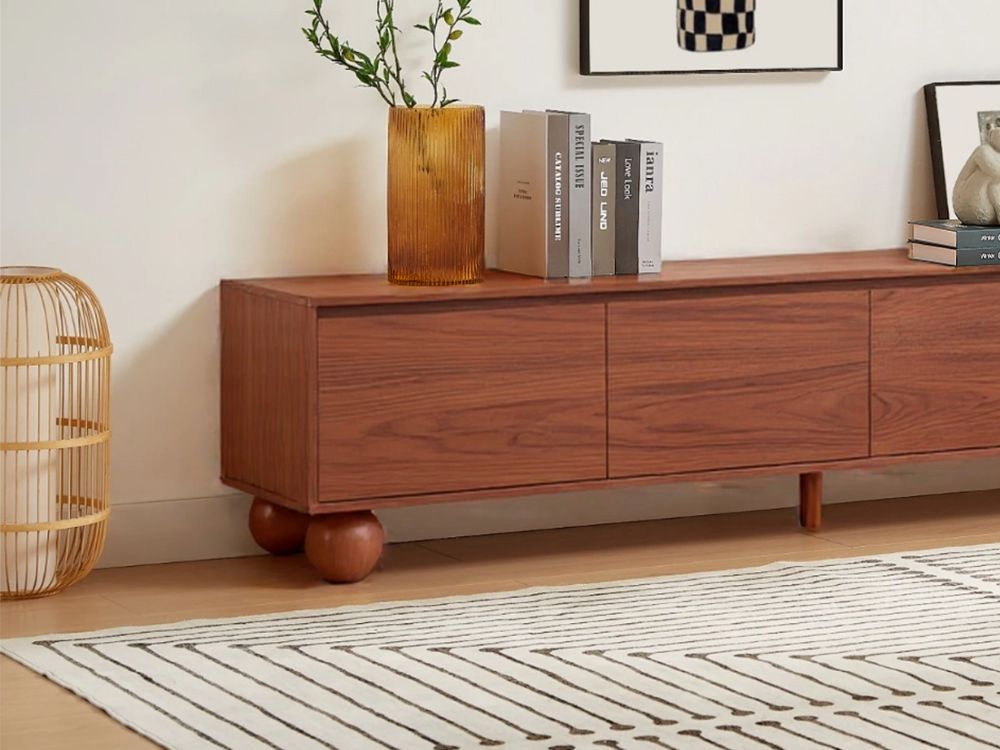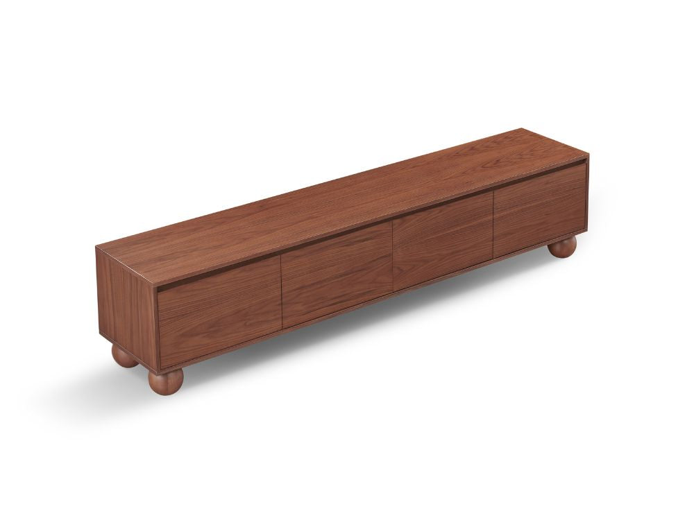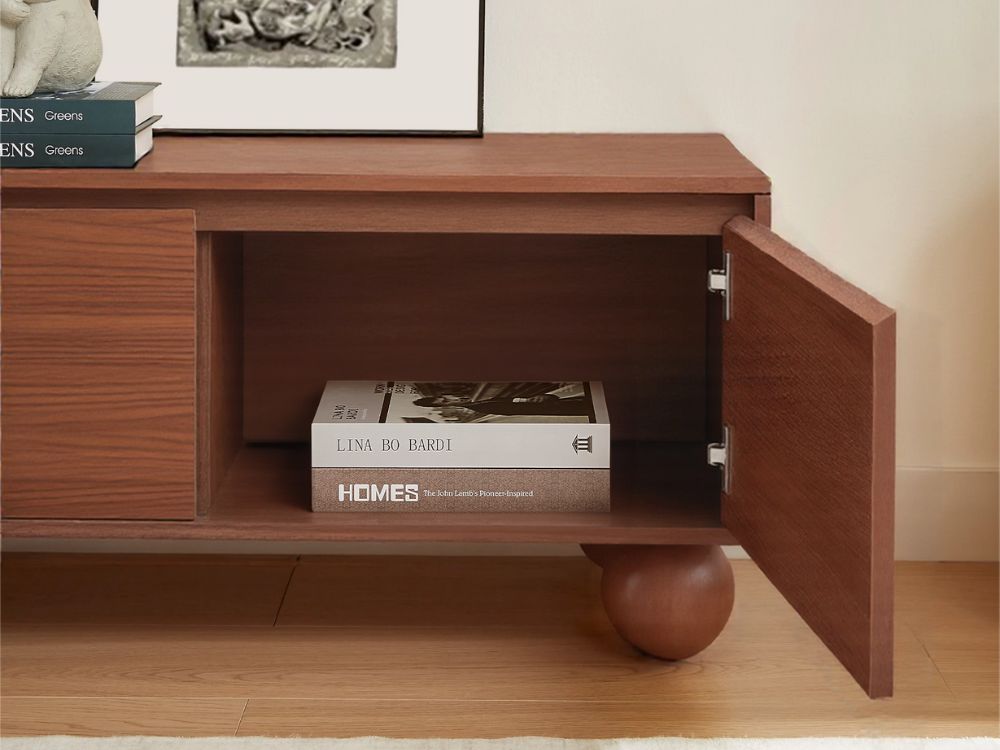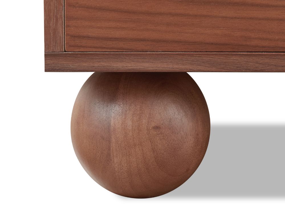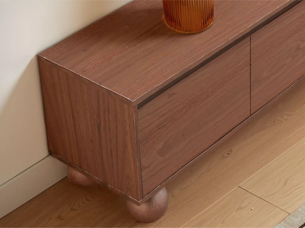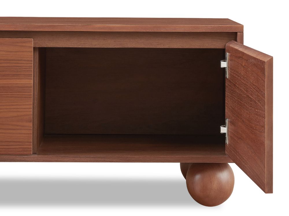 The most distinctive feature of the Ballico TV Unit is its solid rubberwood ball-shaped legs. These spherical supports inject a dose of whimsy into the refined silhouette, softening its linear frame while grounding the piece with sculptural poise. It’s a quiet nod to retro design that feels both nostalgic and forward-thinking.