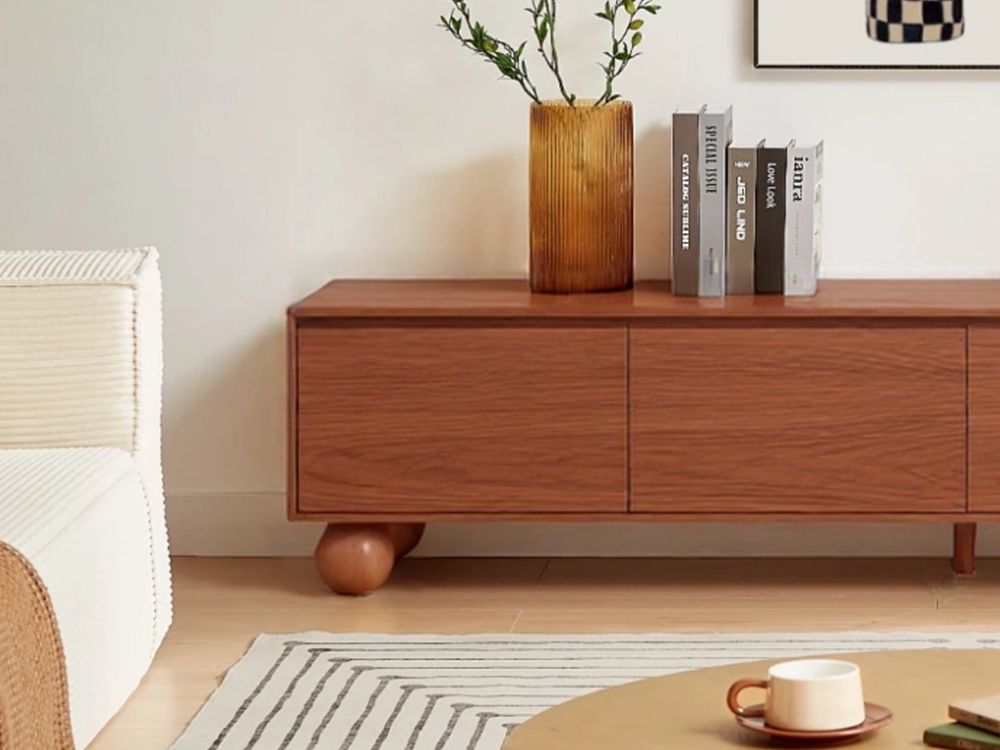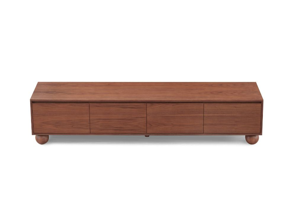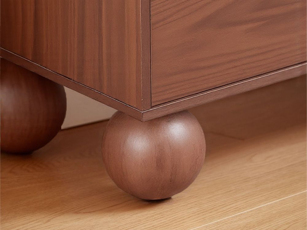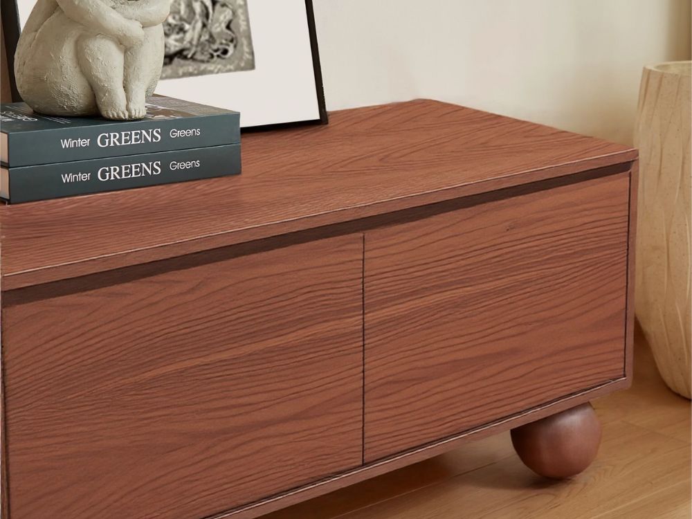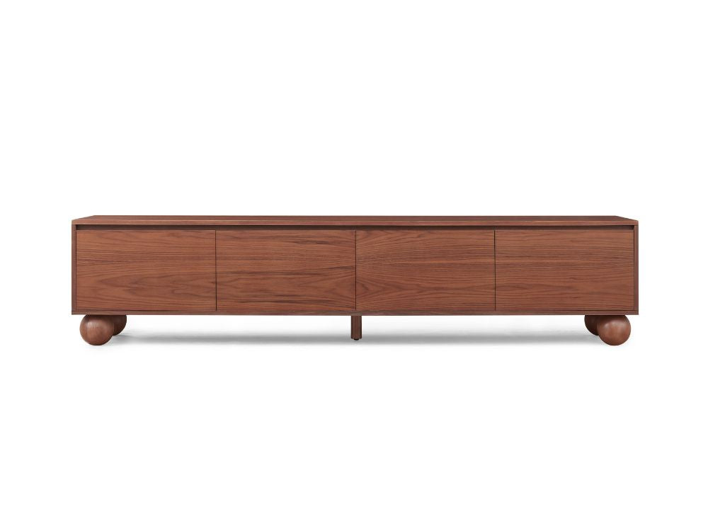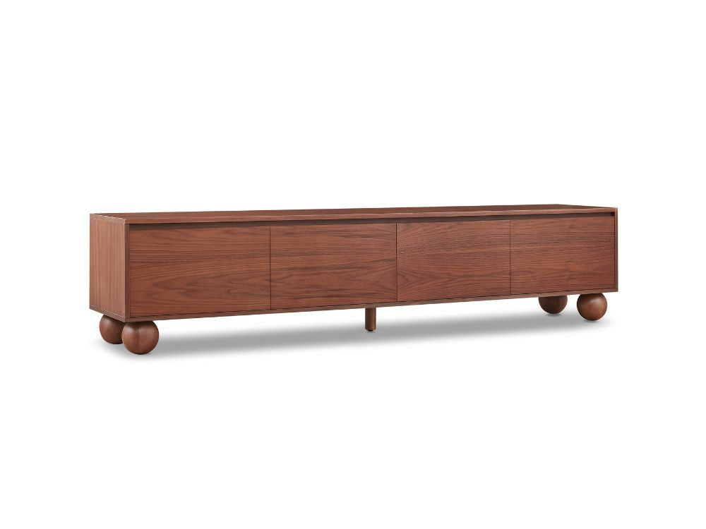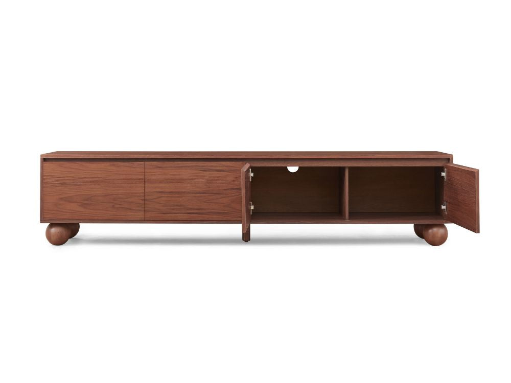 The most distinctive feature of the Ballico TV Unit is its solid rubberwood ball-shaped legs. These spherical supports inject a dose of whimsy into the refined silhouette, softening its linear frame while grounding the piece with sculptural poise. It’s a quiet nod to retro design that feels both nostalgic and forward-thinking.
