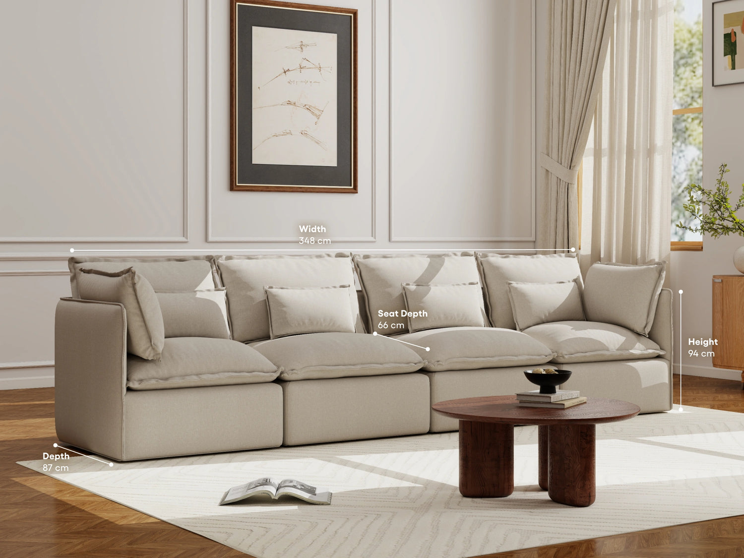 I originally got the 4 seater, I’ve since added two more seats and 2 ottomans. I have 2 toddlers and a dog (and a tradie) AND the white version and I am super impressed with the way it spot cleans. I’ve gotten pen, raspberry and chocolate off without having to wash it in the machine. The pillows get softer everytime we sit on it and it’s firm enough that it has decent support in the back. I hope they bring out more colours! Maybe boucle grey?? Or a chocolate! It has not disappointed me yet!