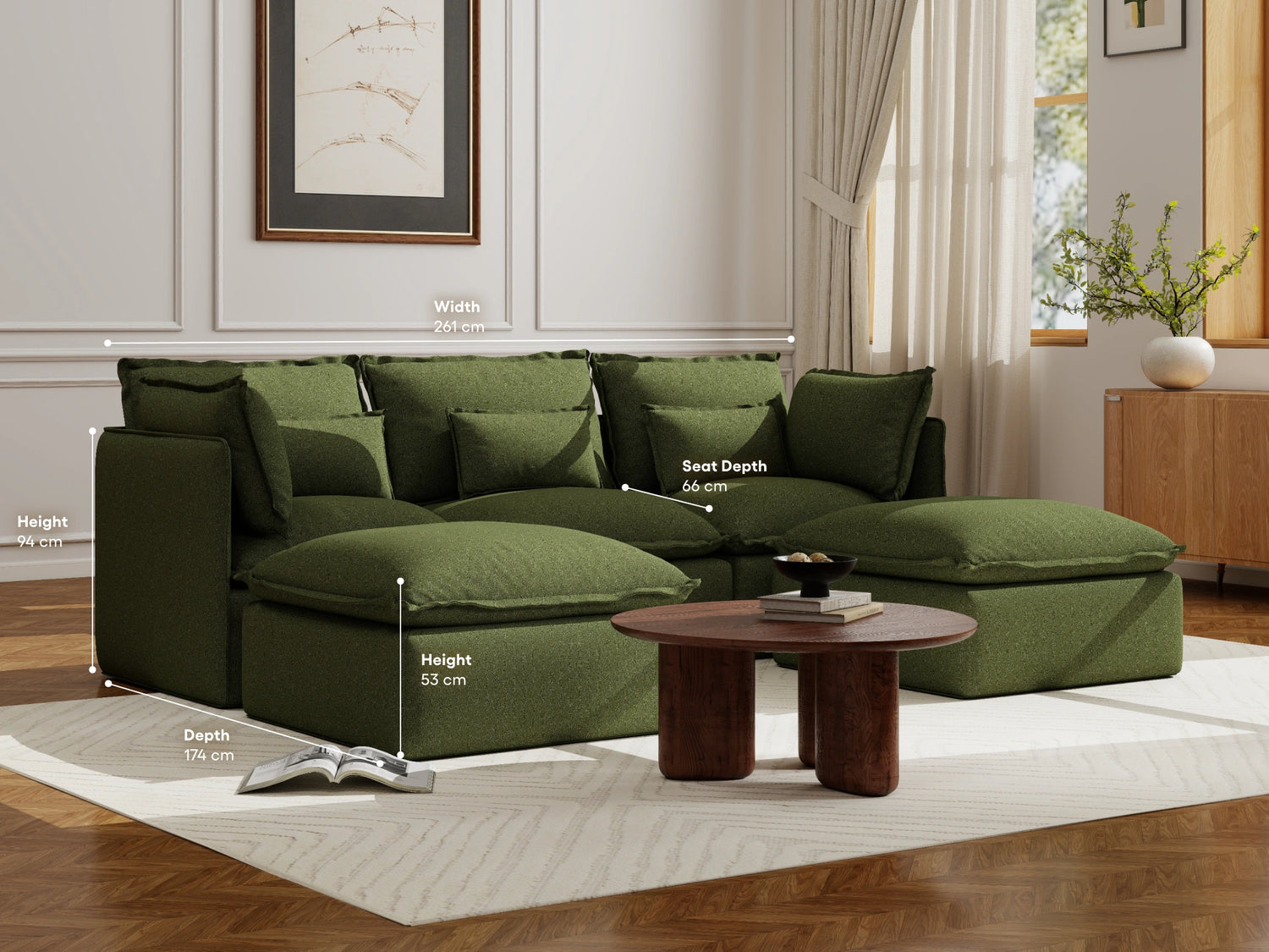 I originally got the 4 seater, I’ve since added two more seats and 2 ottomans. I have 2 toddlers and a dog (and a tradie) AND the white version and I am super impressed with the way it spot cleans. I’ve gotten pen, raspberry and chocolate off without having to wash it in the machine. The pillows get softer everytime we sit on it and it’s firm enough that it has decent support in the back. I hope they bring out more colours! Maybe boucle grey?? Or a chocolate! It has not disappointed me yet!