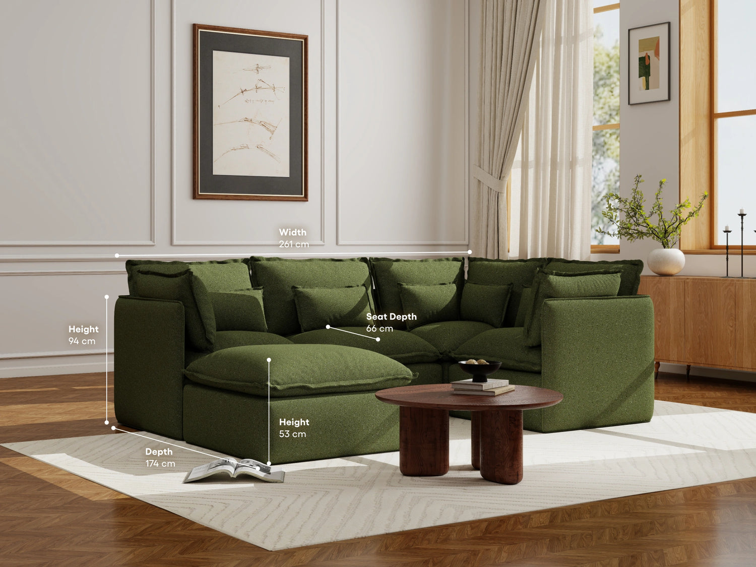I originally got the 4 seater, I’ve since added two more seats and 2 ottomans. I have 2 toddlers and a dog (and a tradie) AND the white version and I am super impressed with the way it spot cleans. I’ve gotten pen, raspberry and chocolate off without having to wash it in the machine. The pillows get softer everytime we sit on it and it’s firm enough that it has decent support in the back. I hope they bring out more colours! Maybe boucle grey?? Or a chocolate! It has not disappointed me yet!