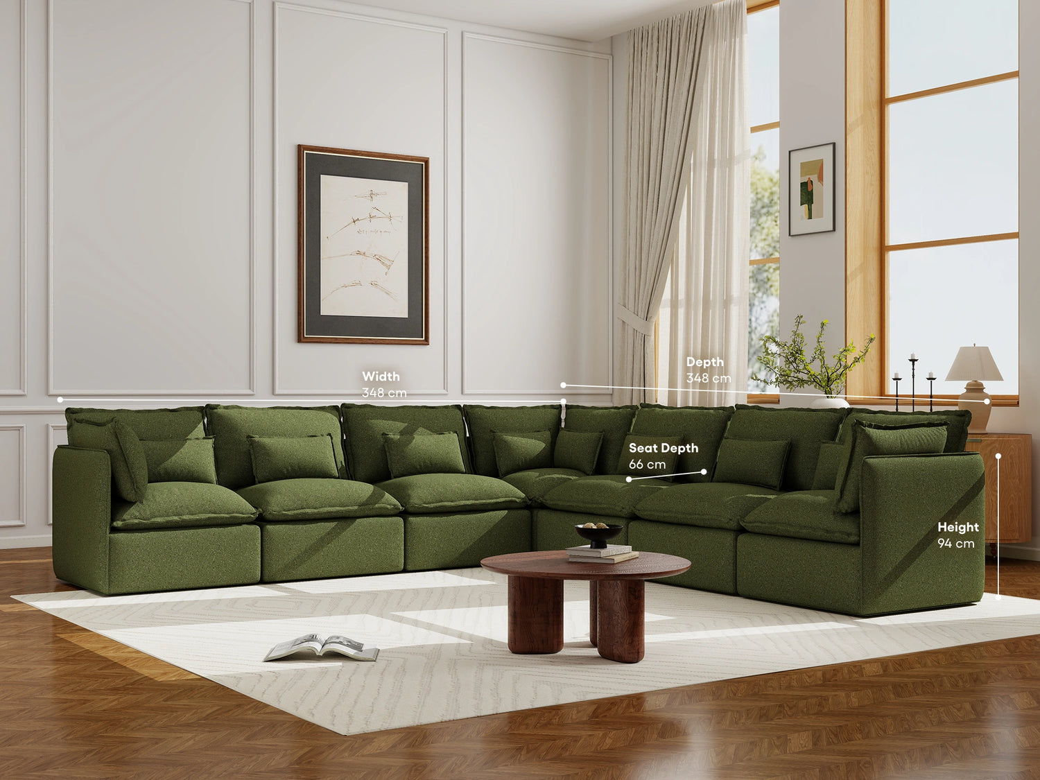I originally got the 4 seater, I’ve since added two more seats and 2 ottomans. I have 2 toddlers and a dog (and a tradie) AND the white version and I am super impressed with the way it spot cleans. I’ve gotten pen, raspberry and chocolate off without having to wash it in the machine. The pillows get softer everytime we sit on it and it’s firm enough that it has decent support in the back. I hope they bring out more colours! Maybe boucle grey?? Or a chocolate! It has not disappointed me yet!