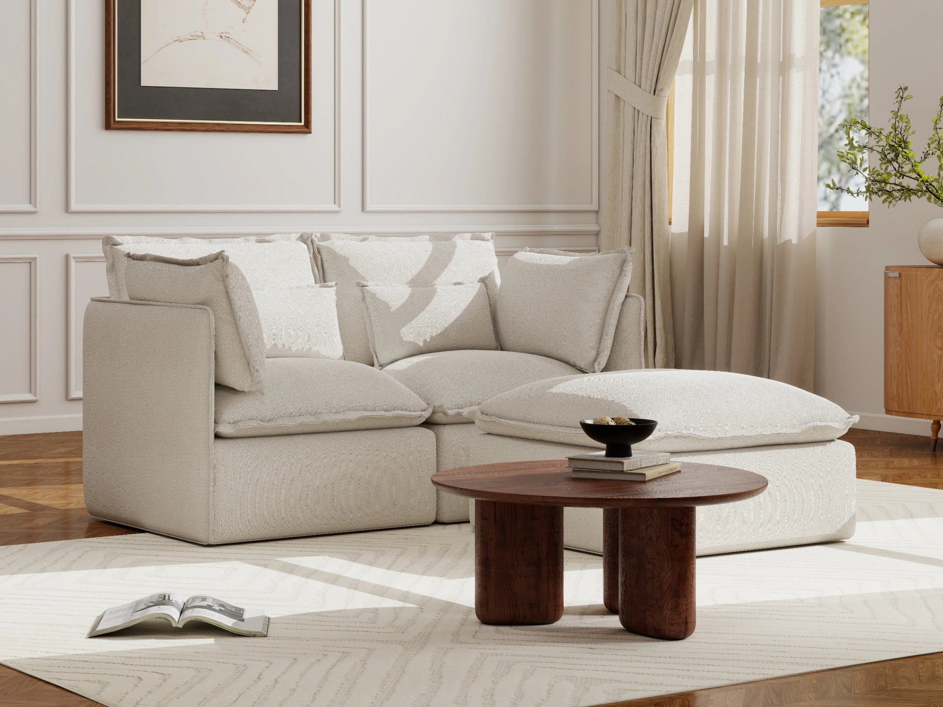 I originally got the 4 seater, I’ve since added two more seats and 2 ottomans. I have 2 toddlers and a dog (and a tradie) AND the white version and I am super impressed with the way it spot cleans. I’ve gotten pen, raspberry and chocolate off without having to wash it in the machine. The pillows get softer everytime we sit on it and it’s firm enough that it has decent support in the back. I hope they bring out more colours! Maybe boucle grey?? Or a chocolate! It has not disappointed me yet!