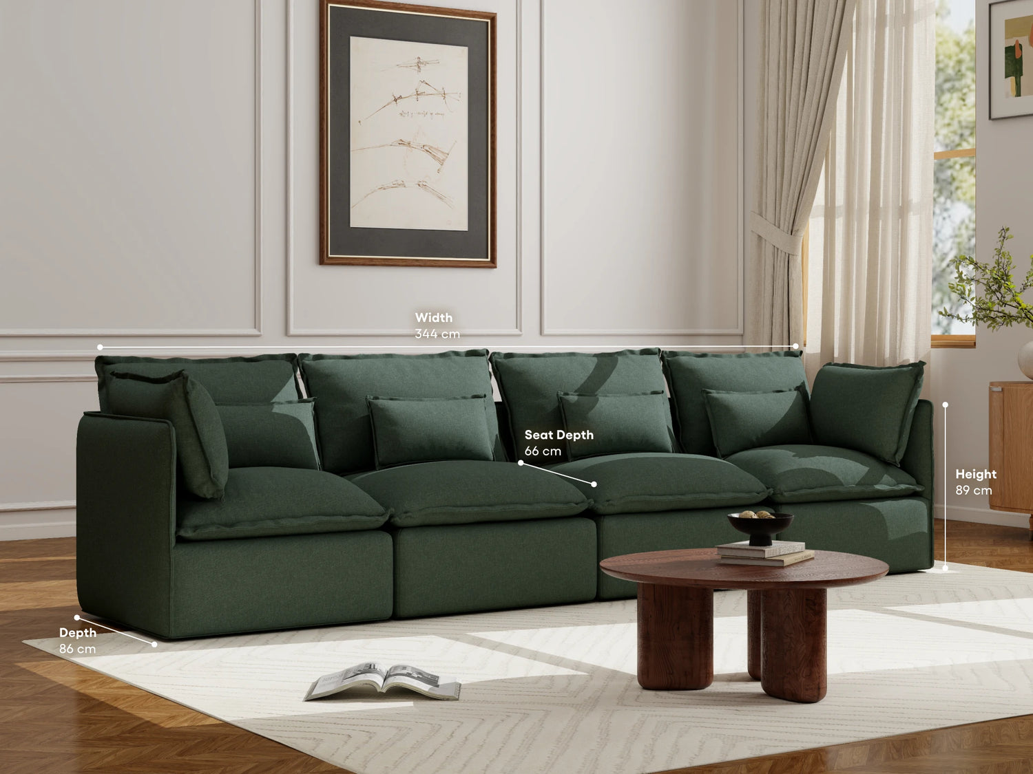 I originally got the 4 seater, I’ve since added two more seats and 2 ottomans. I have 2 toddlers and a dog (and a tradie) AND the white version and I am super impressed with the way it spot cleans. I’ve gotten pen, raspberry and chocolate off without having to wash it in the machine. The pillows get softer everytime we sit on it and it’s firm enough that it has decent support in the back. I hope they bring out more colours! Maybe boucle grey?? Or a chocolate! It has not disappointed me yet!