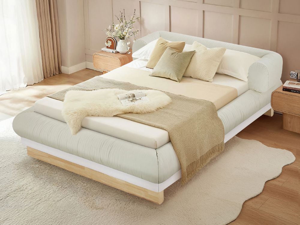 A contrast of textures grounds the bed: the clean, natural wood base subtly peeks through beneath the upholstered frame. This sturdy foundation adds warmth and an organic balance to the plush upper body, delivering both stability and timeless charm.