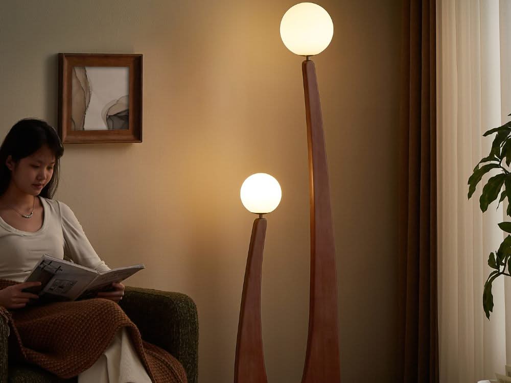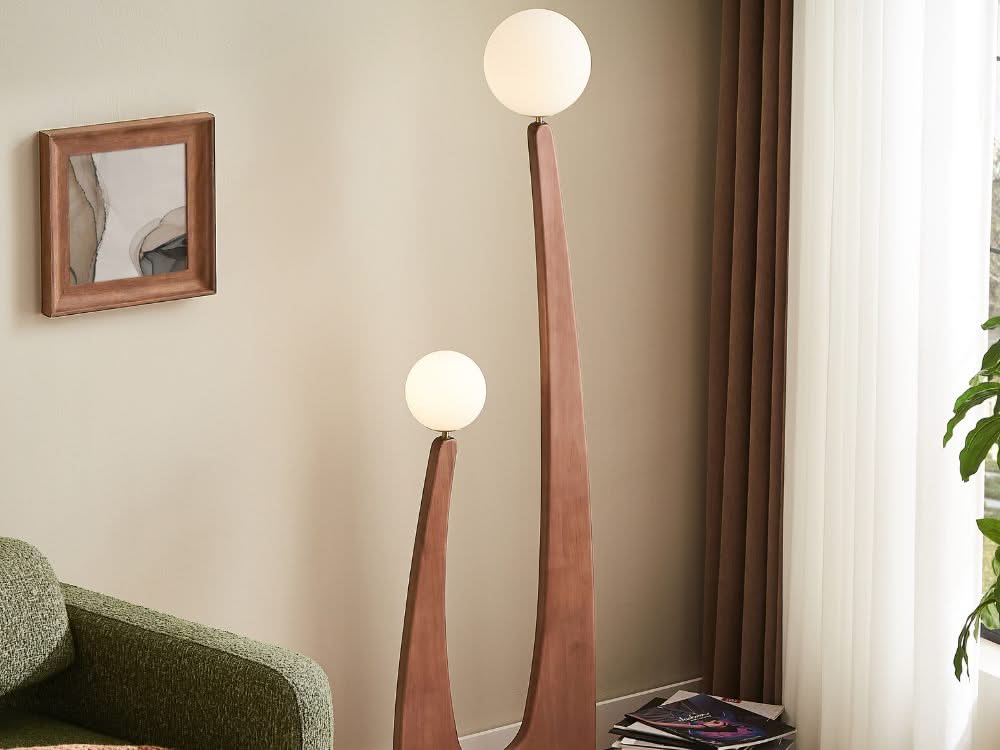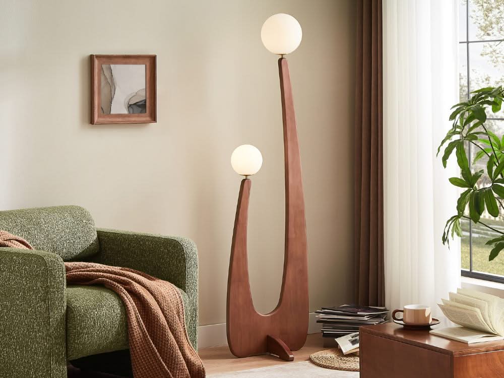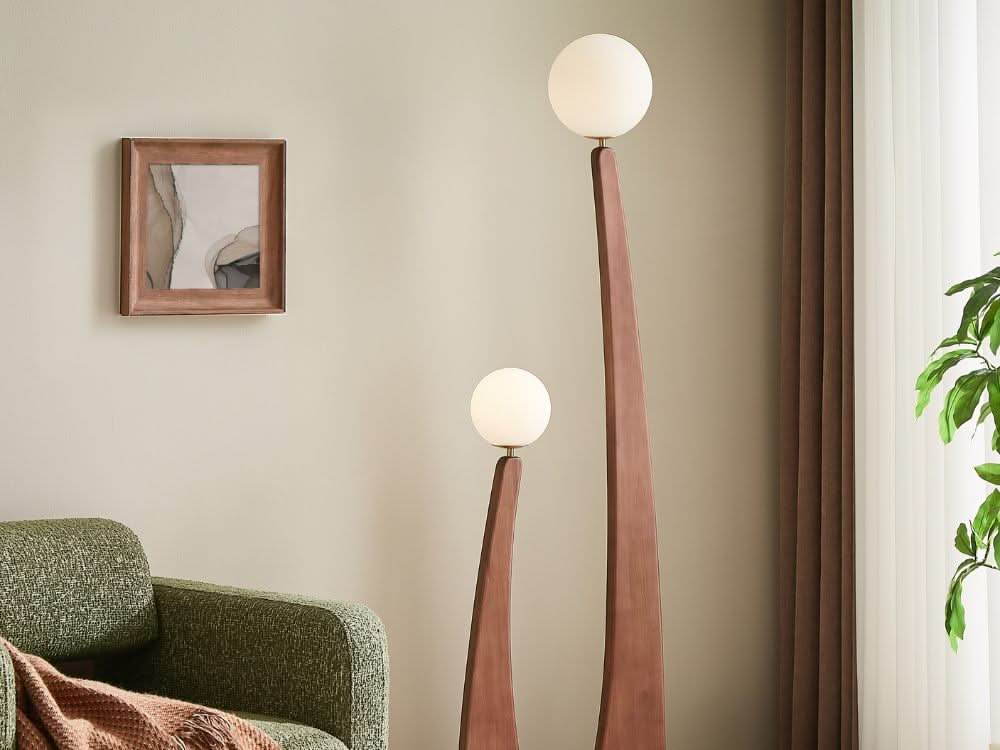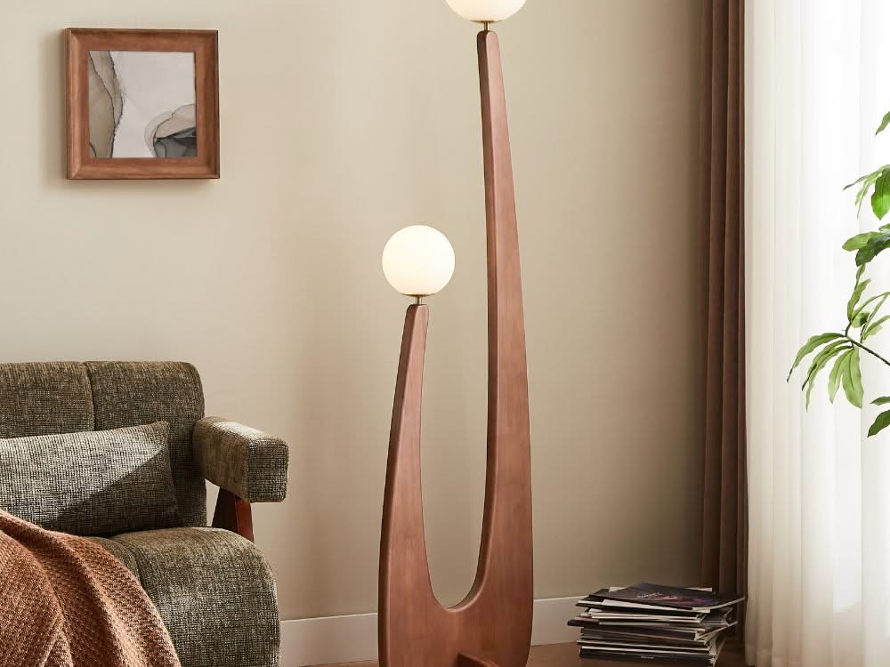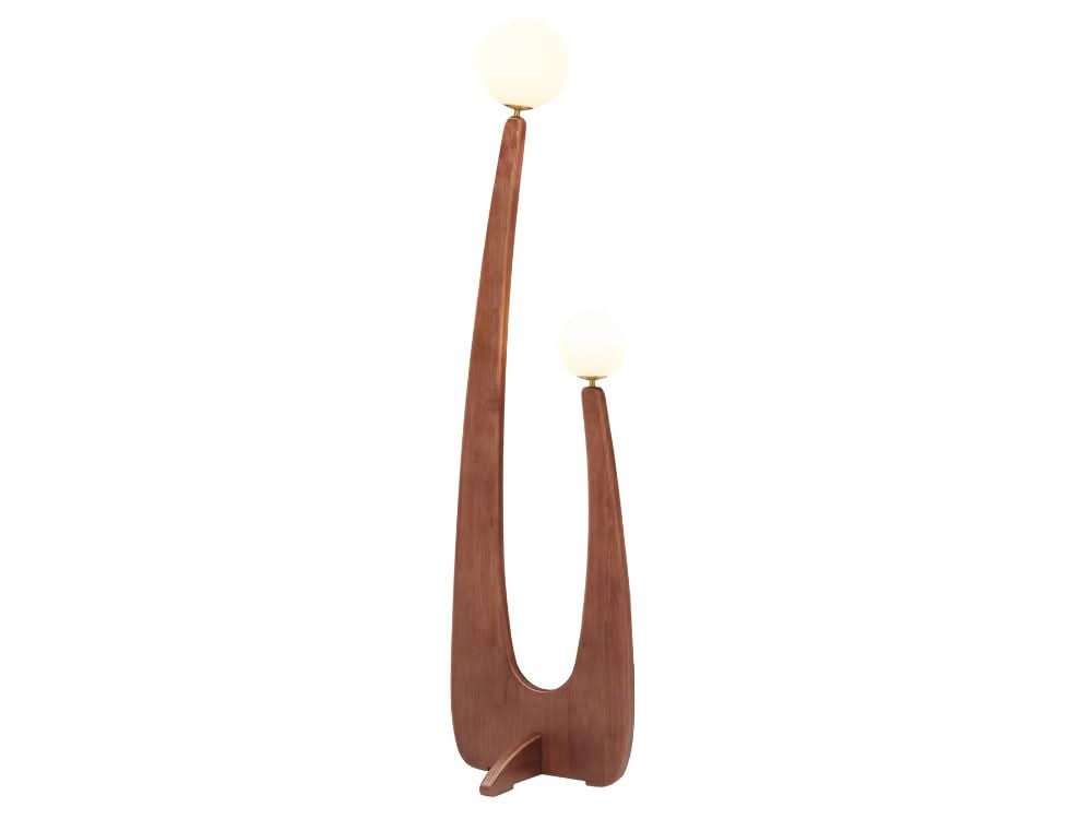 The Stella Floor Lamp redefines modern lighting with its sleek silhouette and artistic presence. Featuring two gracefully arched stems supporting frosted globe shades, this lamp casts a soft, ambient glow, creating an inviting atmosphere in any room. The combination of its wooden finish and minimalist design embodies the modern contemporary style, making it a functional yet sculptural statement piece for your living space.
